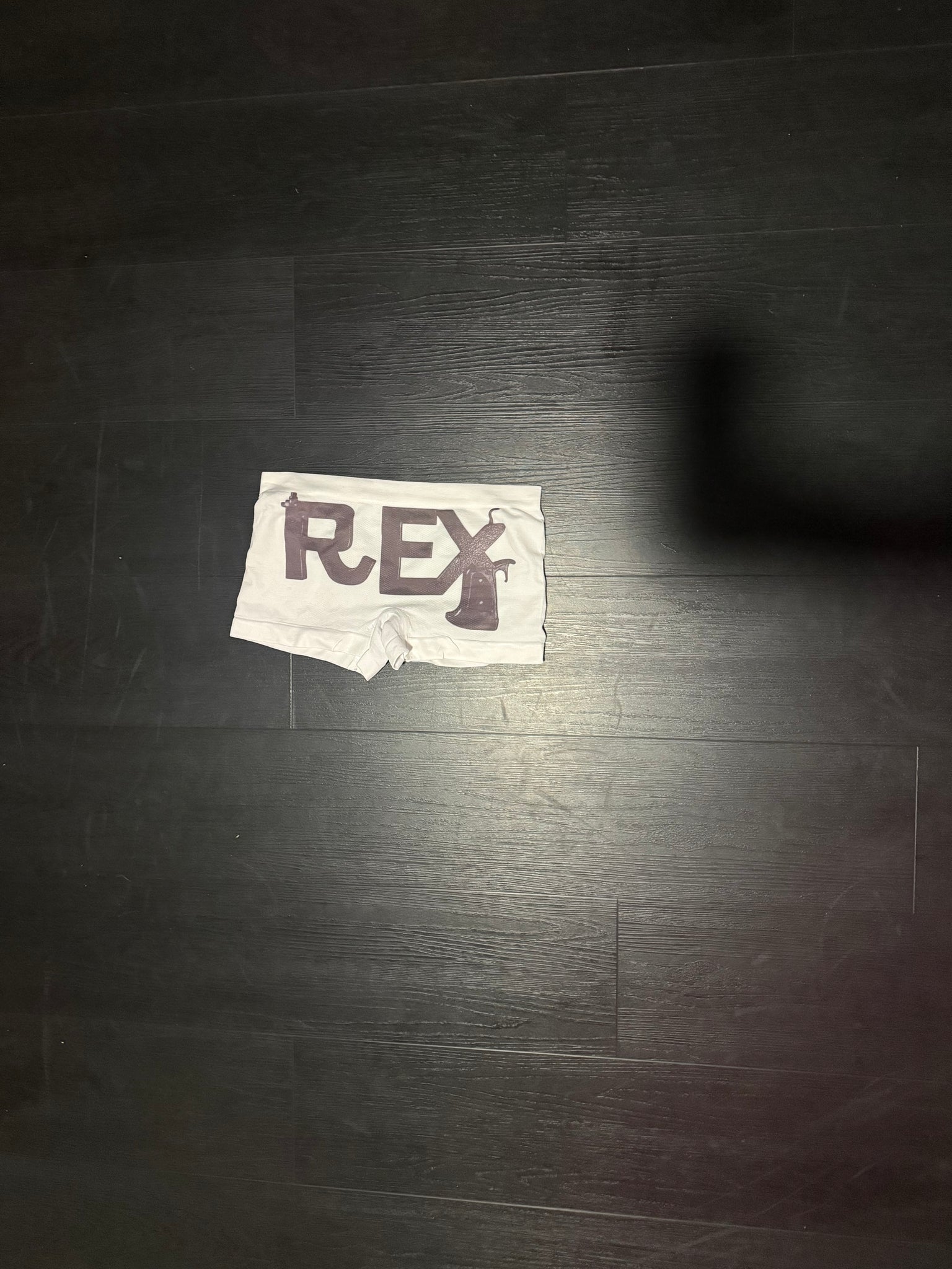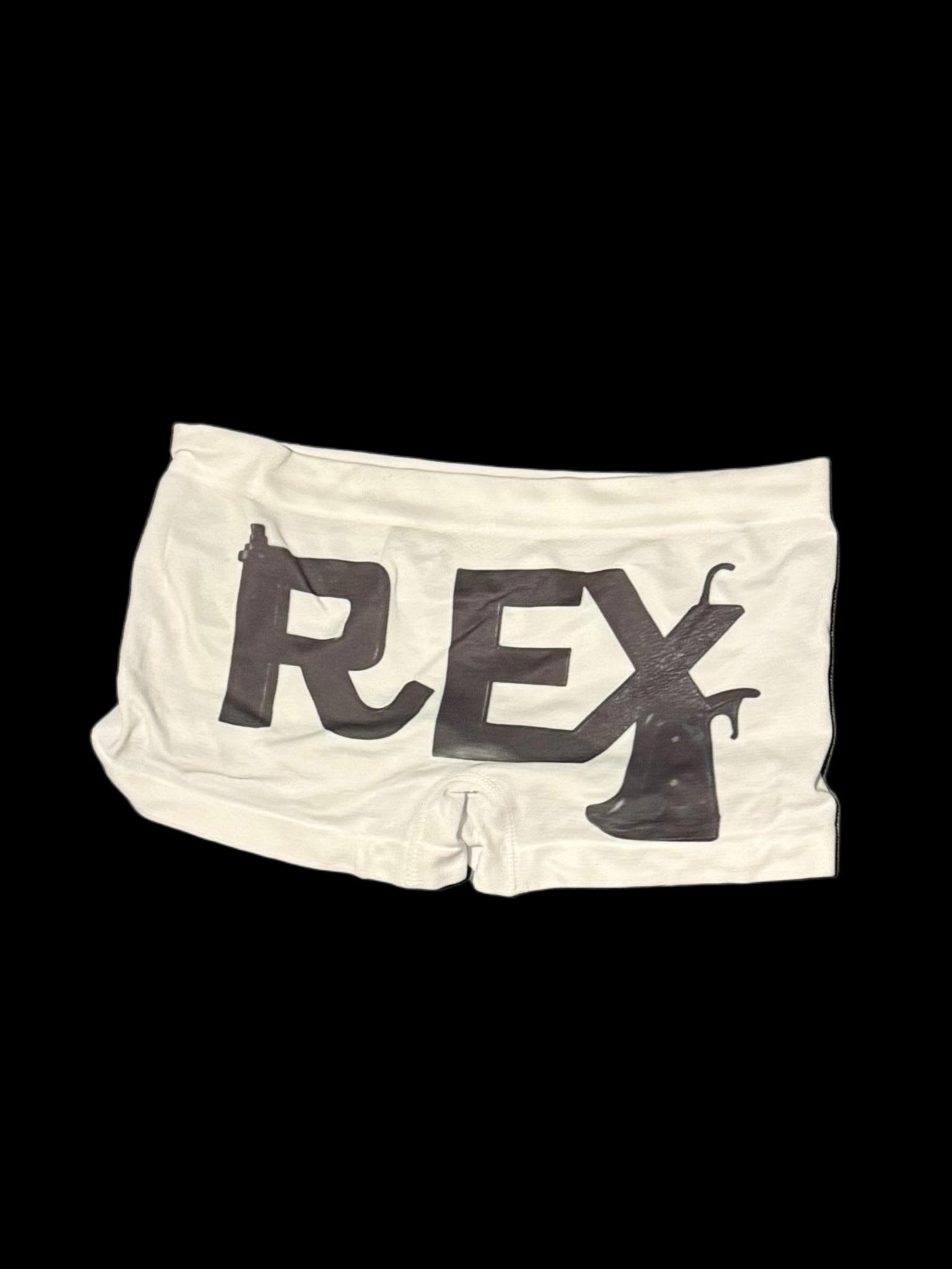 The Silencer Shorts are clean-cut white shorts with something to say. Featuring the R.EX name subtly morphing into a weapon, the placement is your choice—on the front or the back. A metaphor for quiet intensity, disarming beauty, and danger disguised as softness.